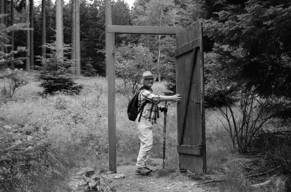 Heute wieder eine Rundwanderung. Zwei Stunden sind wir unterwegs. Und es ist ein guter Rundwanderweg. Vor Allem ist er völlig zeckensicher, denn wir kommen nirgends in die Nähe von Gras oder Gebüsch. Ich bin beruhigt. Und Irgendwo steht am Rande des Weges eine funktionsfähige Türe. Da muss sich wohl einer der Erbauer dieses Wanderweges einen Scherz erlaubt haben. Natürlich muss ich Antonia beim Benutzen dieser Türe fotografieren. Nicht so ganz klar ist mir, wo die Türe hinführt.